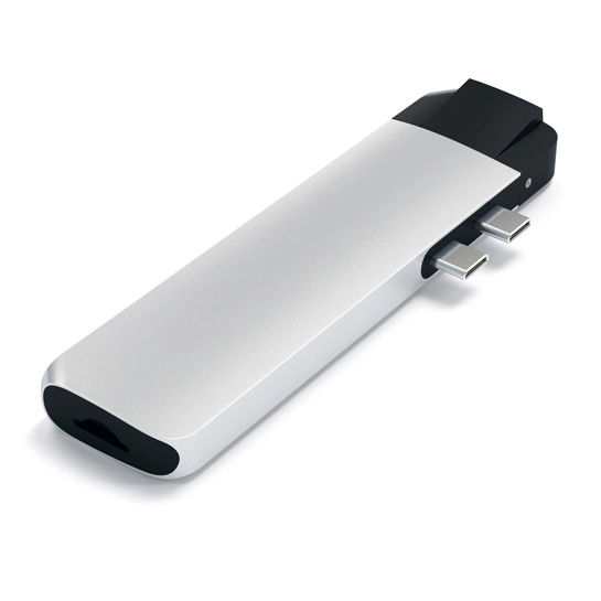 Хаб Satechi очень компактный, стильный и выполнен в строгом дизайне, благодаря чему он превосходно сочетается с техникой Apple. Что касается общего качества устройство, то корпус и конвекторы изготовлены из андонированого алюминия, что защищает его от электромагнитных помех и делает его легким, а также прочным.