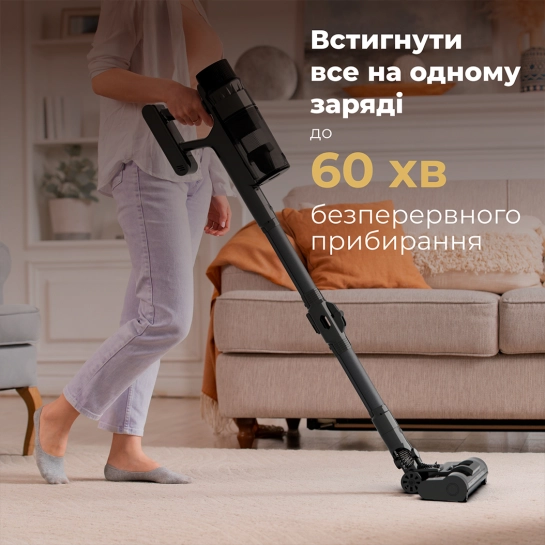 Аккумуляторный пылесос AENO работает целый час и не требует подзарядки. Этого более чем достаточно для уборки квартиры 130м2.