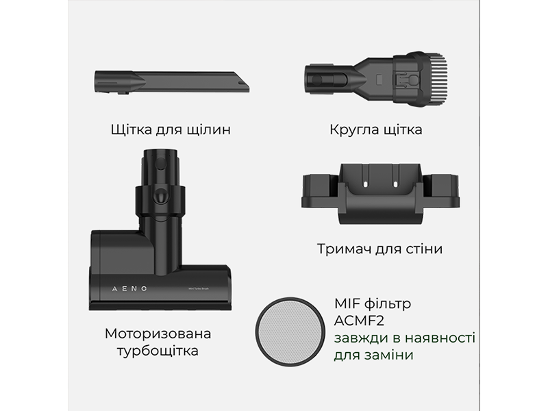 Щелевая щетка, круглая щетка, большая главная щетка, настенный держатель, фильтр MIF (всегда доступен для замены).
