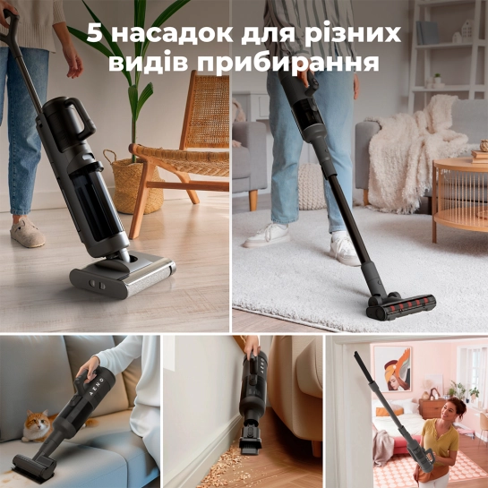 Пылесос-трансформер AENO оснащен 5 насадками, идеально подходящими для уборки твердых полов, ковров, мебели и труднодоступных мест. Его универсальность позволяет поддерживать чистоту во всех помещениях вашего дома быстро, легко и эффективно.