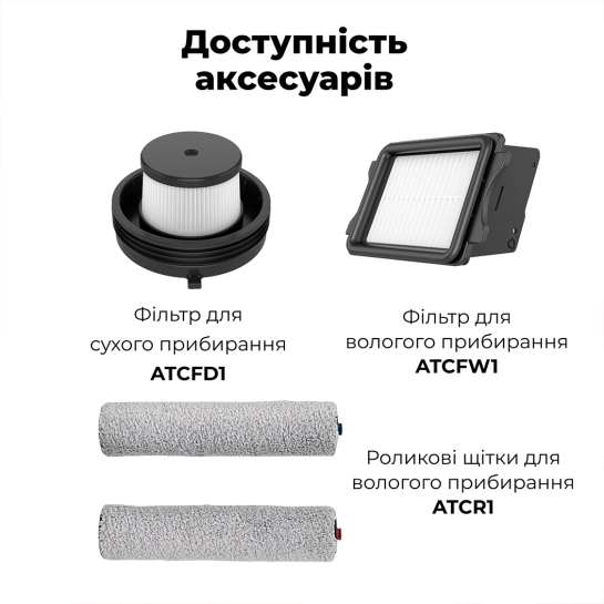 Фильтр для сухой уборки, фильтр для влажной уборки, роликовая щетка для влажной уборки.