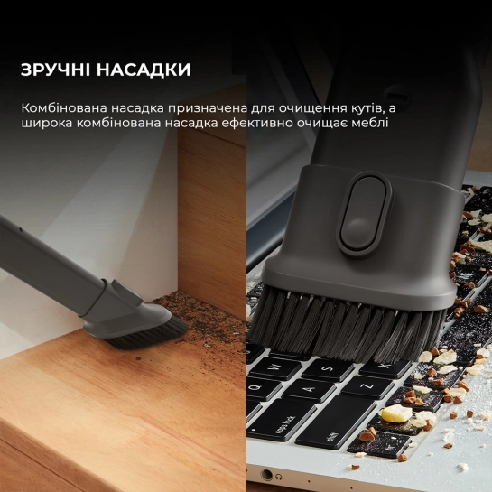 Комбинированная узкая насадка позволяет чистить углы и узкие места, а широкая комбинированная насадка позволяет справляться с загрязнением на столах, окнах и любых других подобных местах.