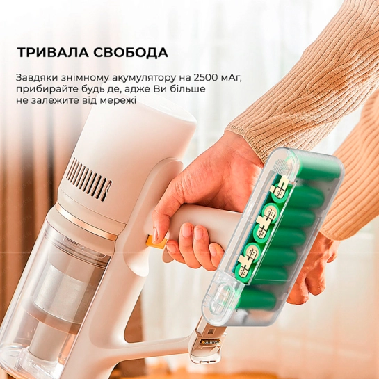 Пылесос оснащен Li-on аккумулятором на 2500 мАч, что обеспечивает до 60 минут непрерывной работы. Аккумулятор расположен рядом с ручкой и снимается одним движением. Поэтому вы сможете заменить батарею на новую, когда это понадобиться.