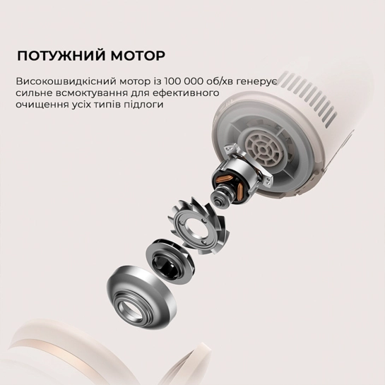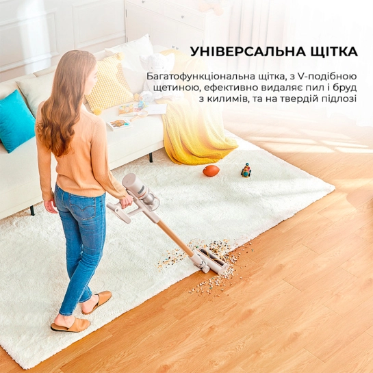 У каждого девайса есть своя маленькая миссия. И у Dreame U20 это — делать уборку быстрой и приятной. Здесь вместо длинных проводов и массивных насадок — свобода движений без привязки к розеткам. Корпус весит всего 1,6 кг, так что вы не устанете от длительной уборки. За автономность отвечает аккумулятор на 2500 мАч — его заряда хватает на 60 минут. Мощность всасывания 22 000 Па позволяет собирать пыль, песок и шерсть на всех типах покрытия, от ковров до напольной плитки. При этом вы не ограничены очисткой полов, а можете также убирать любые поверхности, мебель или салон авто. В комплекте идет 2-в-1 насадка для щелей, углов и мебельных поверхностей, а также моторизованная щетка для обивки и текстиля.
