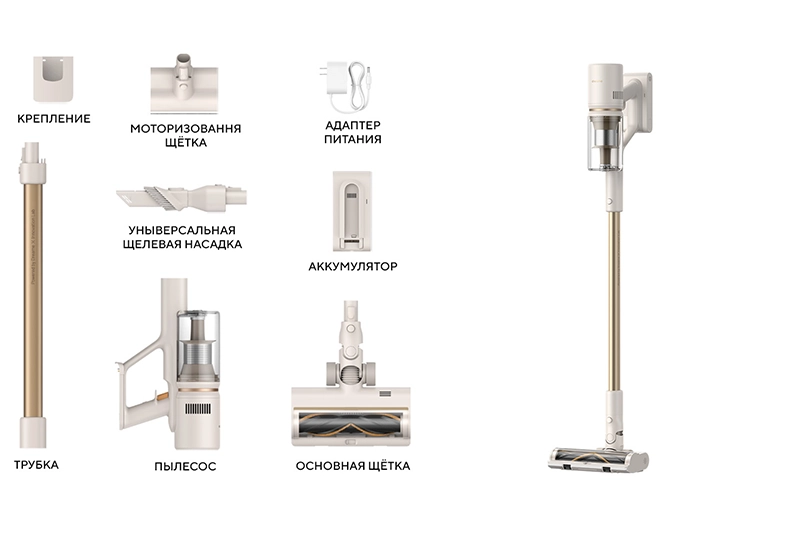 Щелевая насадка комбинированная 2 в 1, Настенное крепление, Адаптер питания, Аккумулятор, Беспроводной пылесос, Центральная трубка, Турбощетка универсальная, Мини-турбощетка, Инструкция пользователя, Гарантийный талон
