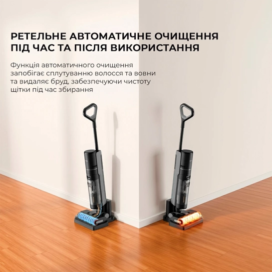 Очищайте пылесос, не контактируя с грязью. Просто поверните его на базу и нажмите кнопку на ручке, чтобы запустить самоочистку. После этого в систему будет подана вода, валик начнет вращаться в разных направлениях, а зубчатый скребок-щетка — очищать остатки грязи под напором. И так, пока весь моющий модуль не будет очищен до конца.