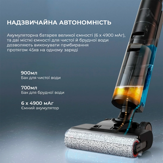Время для генеральной уборки? Dreame проведет его на одном заряде. Благодаря аккумулятору на 6x4900 мАч вы получаете до 45 минут автономности и можете очистить площадь 300 м.кв. Водный резервуар рассчитан на 700 мл, а для сеанса достаточно одного наполнения.