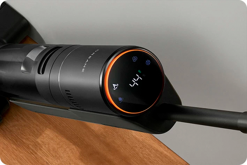 Дисплей показывает выбранный режим и уведомление о возможных ошибках. Если трубка или роликовая щетка засорена, в баке недостаточно воды или резервуар с отработанной жидкостью переполненный, вы увидите это на экране. Индикатор заряда светится зеленым, когда батарея заряжена более чем на 20%, и горит оранжевым, когда заряд меньше 20%.