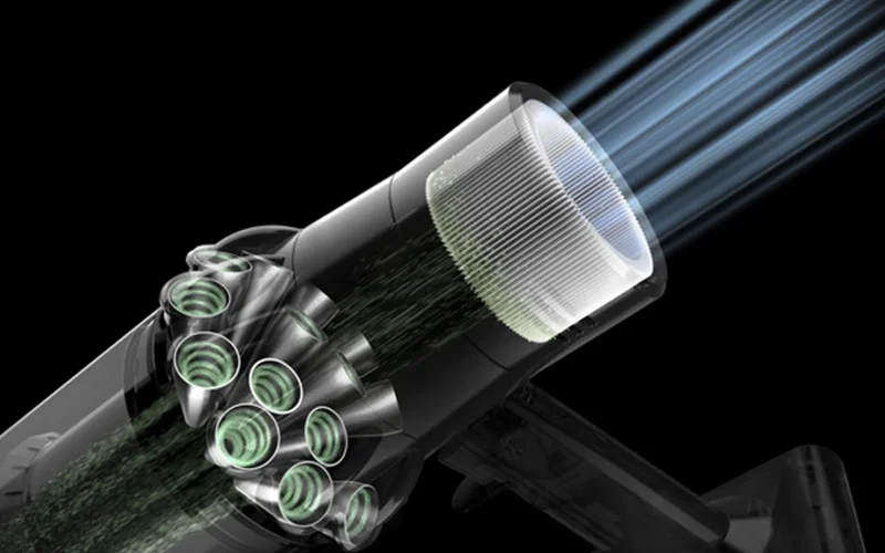 Двигатель, контейнер и циклон расположены на одной линии, поэтому воздух всасывается в циклоны по прямой линии, что помогает создать мощное всасывание Dyson.