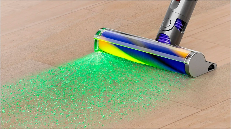 Одной из ключевых особенностей Dyson V12s является лазерная подсветка, позволяющая видеть даже самые маленькие частицы пыли на поверхности. Это особенно полезно при уборке в темных углах или под мебелью. Кроме того, пылесос имеет индикатор заряда батареи, что позволяет вам всегда быть в курсе состояния устройства.
