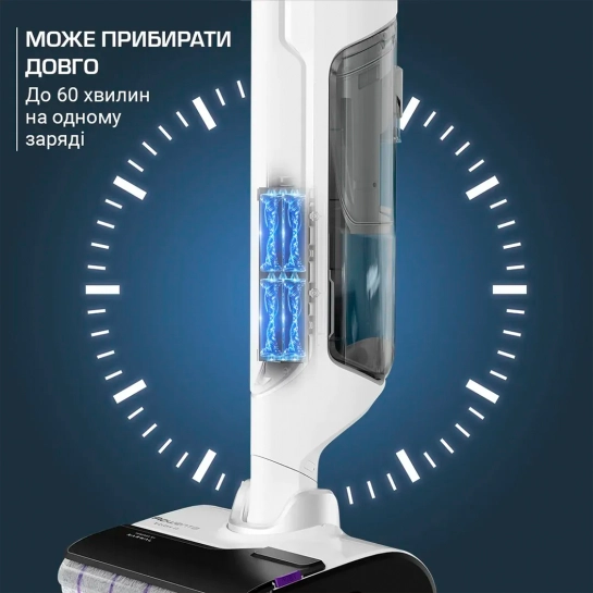 Беспроводная уборка, обеспечивающая до 60 минут работы для очистки любых зон.