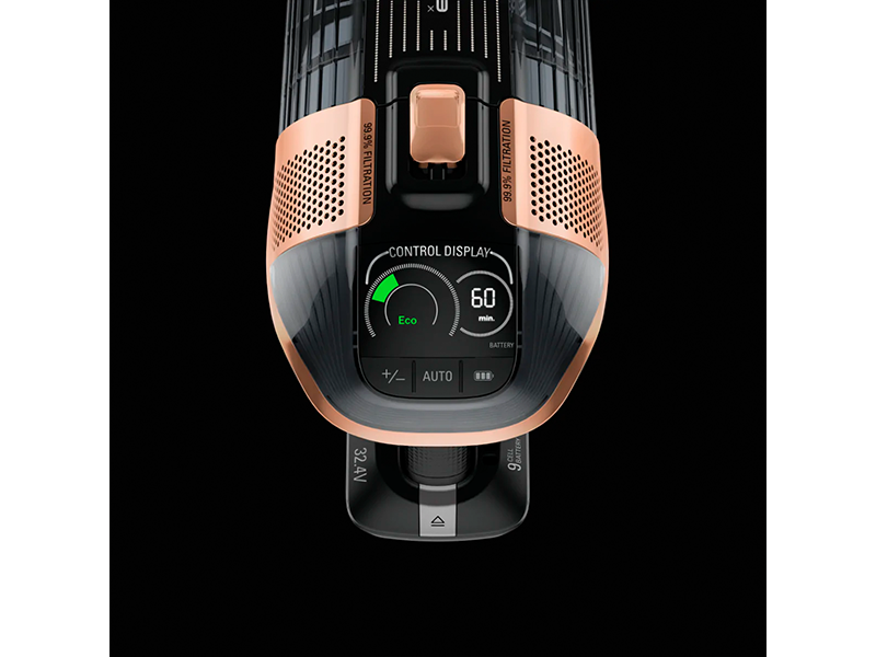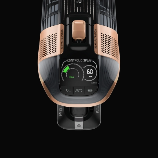 9-элементная батарея/32,4 В обеспечивает бесперебойное всасывание до 1 часа 20 минут, чтобы убрать весь ваш дом от одного заряда с помощью быстрого 3-часового цикла зарядки. При использовании режима Eco.