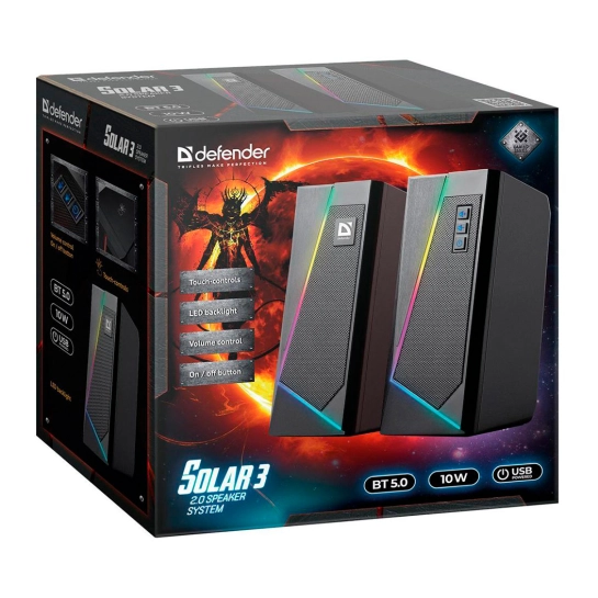 Defender Solar 3 имеет мощность 10 Вт и поддерживает два канала с двумя полосами, что гарантирует чистый и насыщенный звук. Система питается через USB, что делает её удобной в использовании как дома, так и на работе. Лёгкая и прочная конструкция из пластика обеспечивает длительную службу и устойчивость к повреждениям.