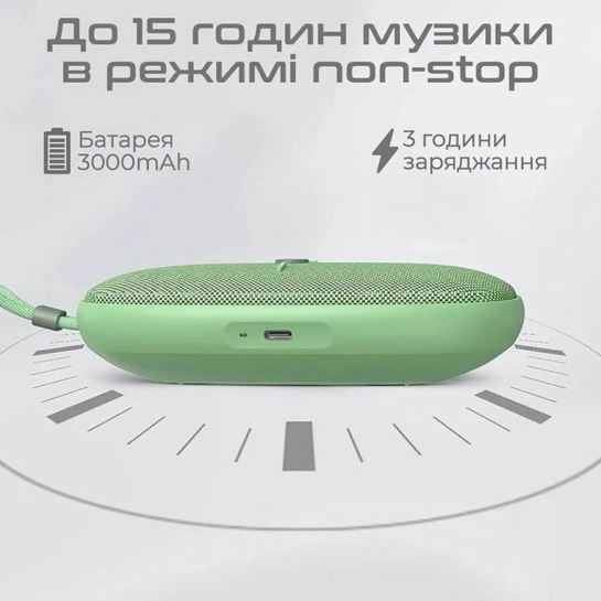 Встроенная Li-Pol батарея 3000 мА·ч обеспечивает до 15 часов непрерывного звучания. Вы можете наслаждаться музыкой целый день без подзарядки, а разъём USB-C позволяет быстро восстановить заряд, используя стандартный кабель. Даже в длительных поездках колонка не подведет.
