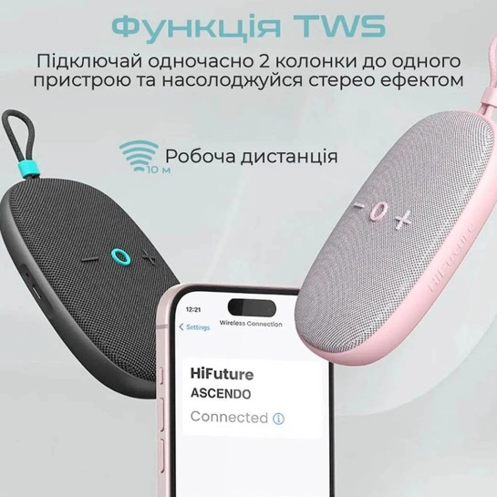 HiFuture Ascendo легко выдерживает дождь, брызги воды и активный отдых у бассейна. Стандарт IPX7 гарантирует защиту от влаги, благодаря чему колонка подходит для пляжных прогулок, поездок на природу и использования в непредсказуемых погодных условиях.