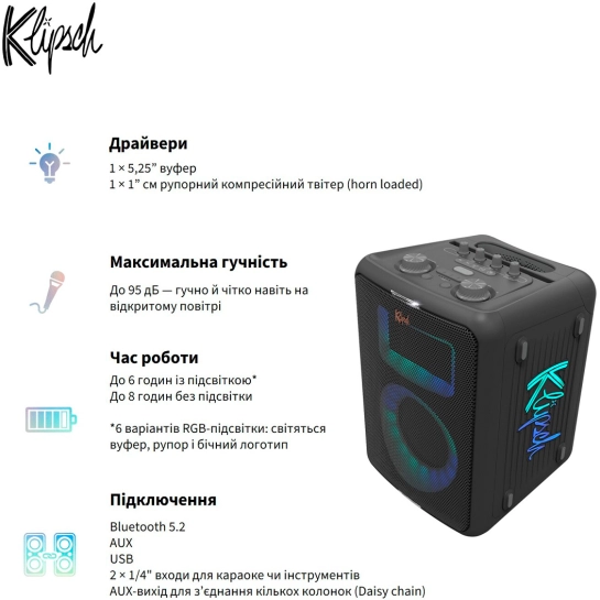 Наслаждайтесь музыкой до 8 часов с подсветкой или 12 часов без нее, всего за 2,5 часа зарядки — идеально подходит для вечеринок в помещении или на улице.
