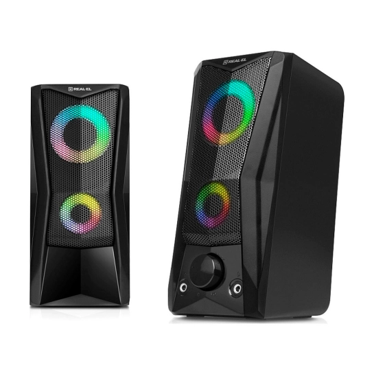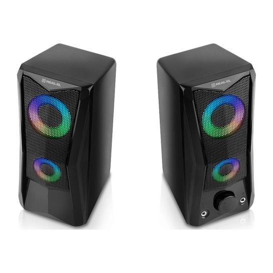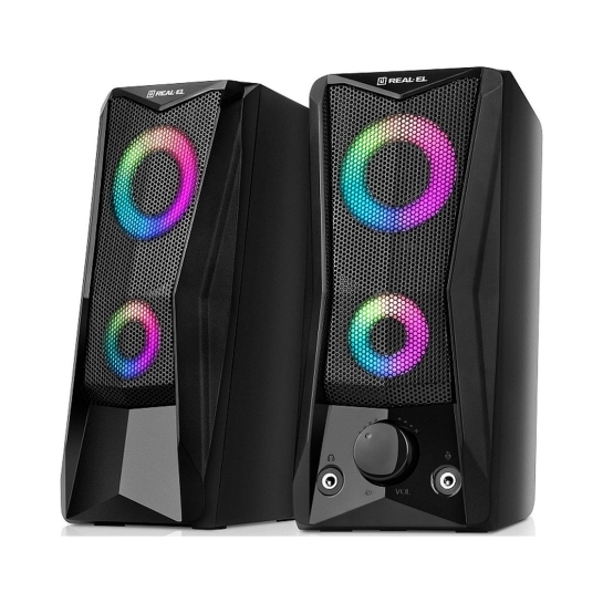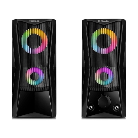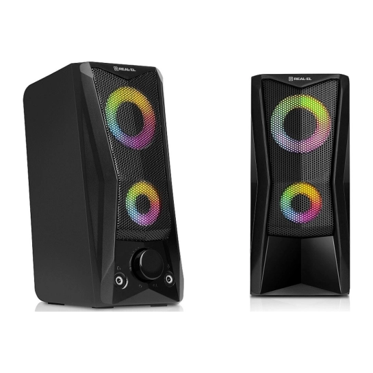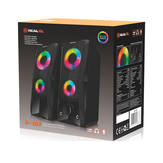 REAL-EL S-107 оснащена удобным регулятором громкости и дополнительными разъёмами для подключения наушников и микрофона. Яркая динамическая подсветка добавляет визуальной выразительности и создаёт приятную атмосферу во время работы за компьютером или отдыха с любимой музыкой.