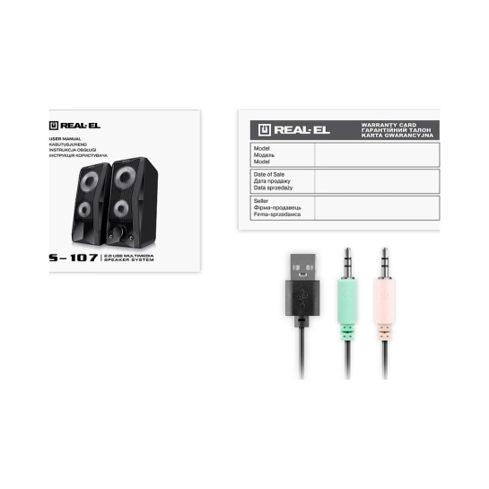 Мультимедийная акустическая система REAL-EL S-107 — это простое и надёжное решение для озвучивания компьютера или ноутбука. Система оснащена встроенным усилителем, а также акустическими и сигнальными кабелями, что позволяет подключать её практически к любым источникам аудиосигнала. Питание осуществляется через USB-порт ПК, ноутбука или блока питания 5V DC с помощью встроенного USB-кабеля.