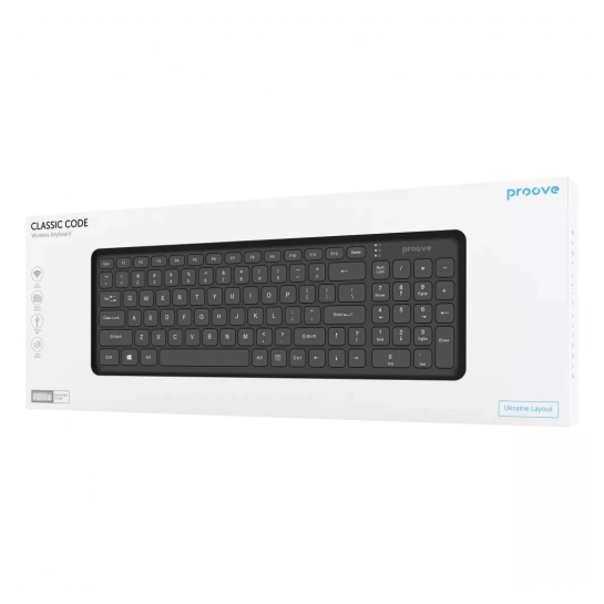 Proove Classic Code підключається до вашого комп’ютера або ноутбука за допомогою USB трансмітера на частоті 2.4 ГГц, що гарантує стабільний і надійний зв’язок. Для живлення клавіатури використовується одна батарейка типу AAA, що робить її зручною у використанні – просто вставте батарейку і насолоджуйтеся безперервною роботою.