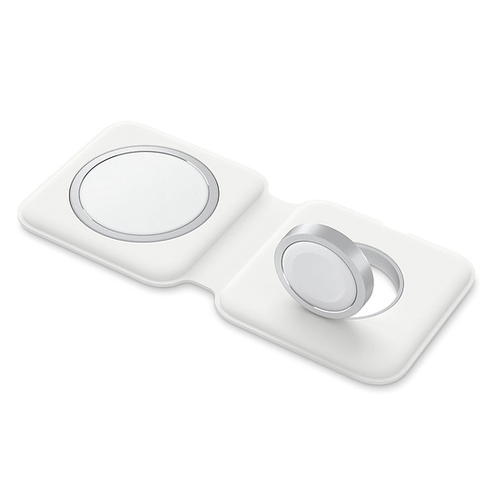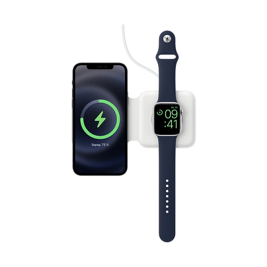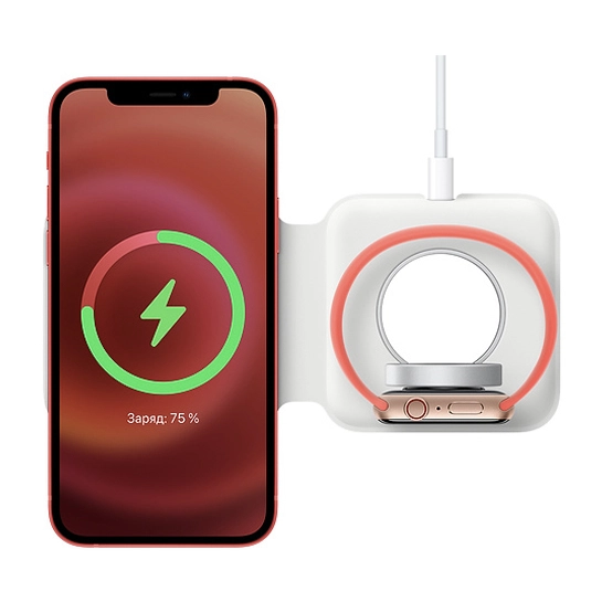 С двойным зарядным устройством MagSafe Duo удобно заряжать совместимые модели iPhone и Apple Watch, беспроводной зарядный футляр для AirPods, а также другие устройства стандарта Qi. Просто положите их на зарядное устройство — и они начнут стабильно и эффективно заряжаться. Кроме того, зарядное устройство компактно складывается, поэтому его удобно брать с собой.