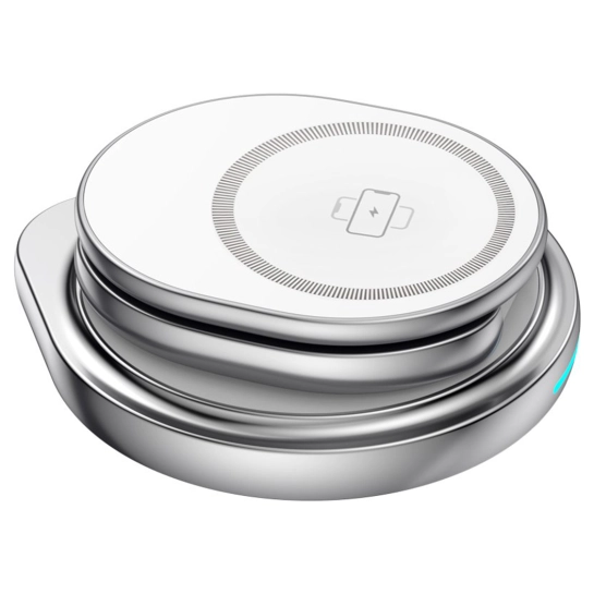 Зарядная станция может вращаться на 360 градусов, что обеспечивает максимальное удобство при использовании. Магнитное крепление для телефона позволяет удобно просматривать контент во время зарядки как в вертикальном, так и в горизонтальном положении. Внизу зарядного устройства расположена световая индикация, которая сигнализирует о состоянии зарядки.