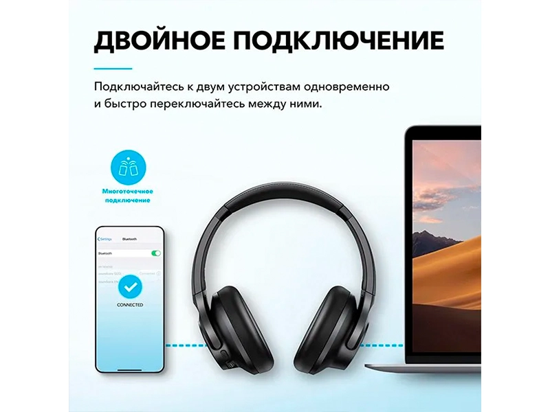 Подключайтесь к двум устройствам одновременно с помощью Bluetooth 5.0 и мгновенно переключайтесь между ними. Независимо от того, работаете ли вы на ноутбуке или хотите ответить на телефонный звонок, звук будет автоматически воспроизводиться с того устройства, с которого вам нужно услышать.