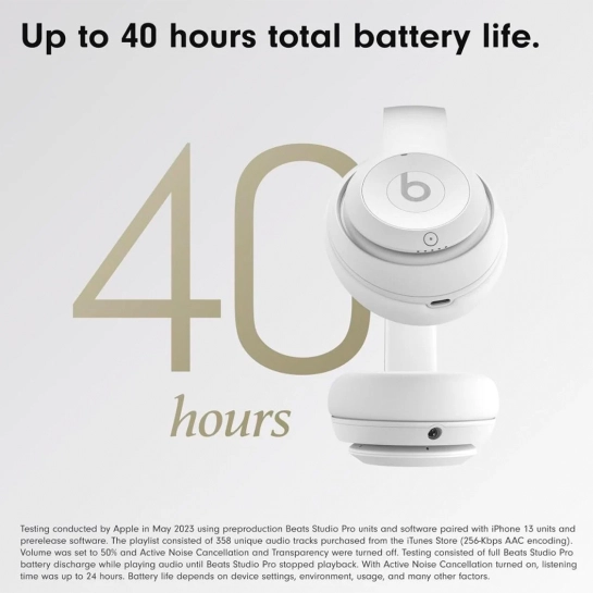 Наушники Beats Studio Pro, работающие от аккумулятора до 40 часов, позволят вам дольше погрузиться в музыку. С включенным ANC или режимом прозрачности наслаждайтесь прослушиванием до 24 часов. Когда у вас мало энергии, Fast Fuel обеспечит вам до 4 часов игрового времени от быстрой 10-минутной зарядки.