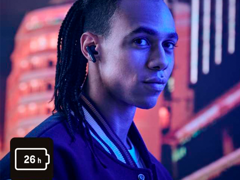 Благодаря аккумулятору в футляре, обеспечивающему до 20 часов работы и возможности зарядки через разъем USB-C, наушники B110W всегда готовы к использованию. Компактная круглая форма футляра делает его удобным для хранения в кармане или сумке.