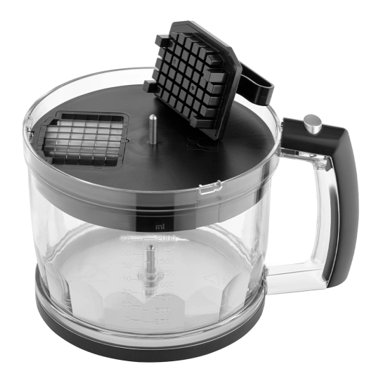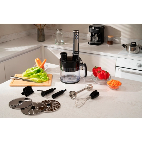 Устройство имеет тонкую эргономичную рукоятку со специальным противоскользящим покрытием и подсветкой кнопок управления. Лезвие изготовлено из нержавеющей стали, на ножке предусмотрена защита от разбрызгивания. В комплекте: чаша объемом 2 000 мл, насадка для взбивания, насадка для нарезки кубиками, насадка для нарезки в форме картофеля фри. Длина кабеля питания составляет 1,3 м.