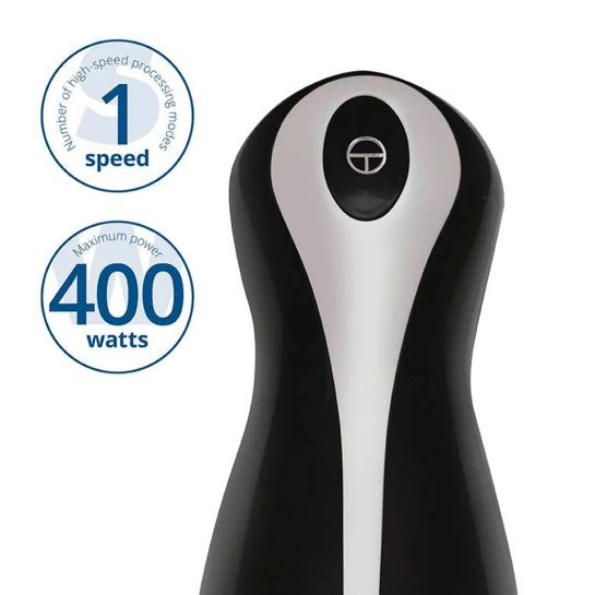 По типу это погружной, ручной блендер, при создании которого использовались два материала: прочный ударостойкий пластик и высококачественная каленая сталь с хромовым антикоррозийным напылением, из которой выполнена рабочая часть. Мощность 400 Вт, это позволяет обрабатывать сложные ингредиенты с минимальным потреблением электрической энергии.