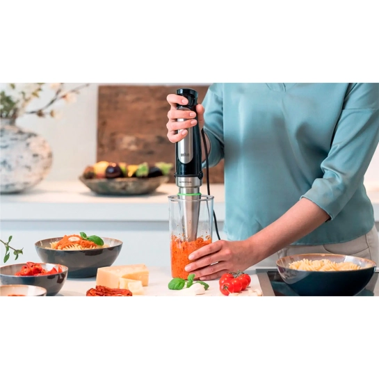 Особенностью данного блендера является технология ACTIVEBlade, благодаря которой лезвия движутся вверх и вниз, обеспечивая на 40% более эффективное измельчение продуктов, что значительно сокращает время приготовления. Кроме того, система Easy SmartSpeed позволяет изменять скорость вращения лезвий одним движением пальца по кнопке на ручке, что делает управление блендером интуитивно понятным и удобным.