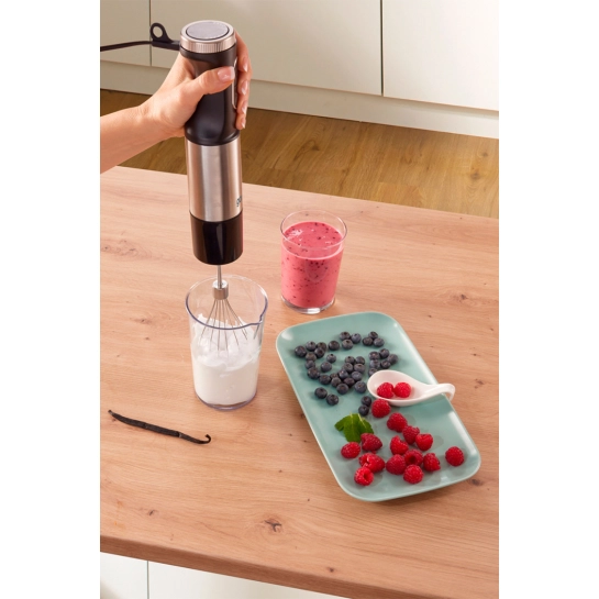 В комплекте с этой моделью поставляется множество дополнительных аксессуаров. Используйте насадки для смешивания из нержавеющей стали, чтобы легко приготовить идеальные пюре, соусы, смузи, супы и т.д. Достаточно одного движения, чтобы прикрепить насадку для сбивания. Это удобно, когда нужно взбить яйца или сливки. С помощью измельчителя с чашей объемом 500 мл можно эффективно измельчить твердые продукты на более мелкие куски.