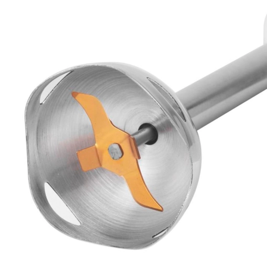 Пластиковый корпус блендера имеет стильный белый цвет, а прорезиненные кнопки обеспечивают удобство использования. Съемная нога из нержавейки позволяет легко очищать устройство после использования.