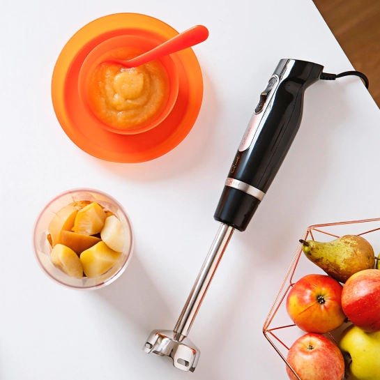 - Принадлежности из нержавеющей стали, что позволяет перемешивать и горячие продукты
