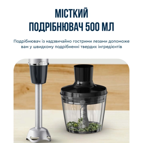 Многофункциональность: В комплекте вы найдете все необходимое для приготовления разнообразных блюд: Погружной блендер: Для измельчения, смешивания и взбивания. Мини-измельчитель: Для измельчения небольших порций. Венчик: Для взбивания сливок, яиц и других ингредиентов.