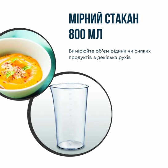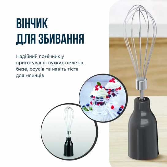 Многофункциональность: В комплекте вы найдете все необходимое для приготовления разнообразных блюд: Погружной блендер: Для измельчения, смешивания и взбивания. Мини-измельчитель: Для измельчения небольших порций. Венчик: Для взбивания сливок, яиц и других ингредиентов.