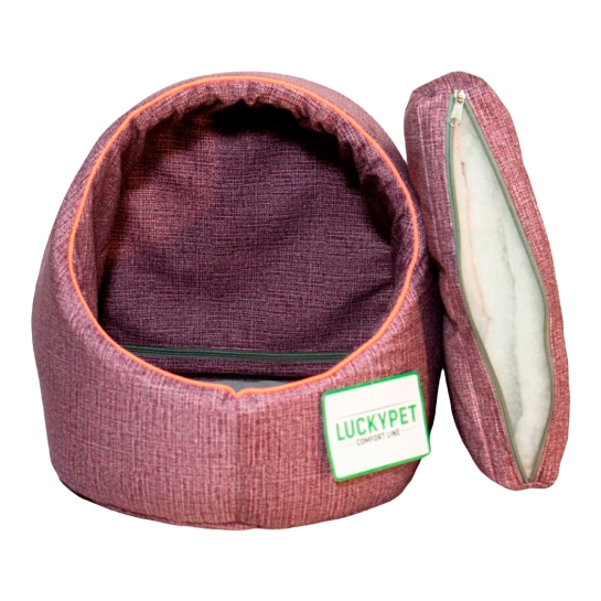 Форма домика напоминает небольшую уютную колыбельку. Открытый вход со средним бортиком позволяет питомцу легко заходить в своё жилище. Большая часть купола закрыта, создавая комфортное и уединённое пространство для отдыха. При этом открытый вход оставляет возможность наблюдать за происходящим вокруг. Наполнитель — листовой синтепон, который защищает от сквозняков и холодного пола, сохраняя тепло и мягкость.