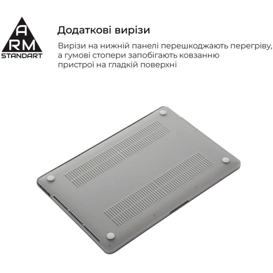 Чехол оснащён прорезями для вентиляции и прорезиненными ножками, которые предотвращают скольжение на поверхности и обеспечивают дополнительный приток воздуха. Он легко надевается и снимается без риска повредить корпус ноутбука.