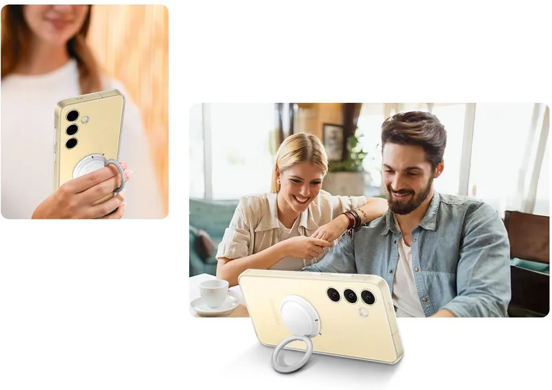 Чехол Clear Gadget Case для Samsung имеет на задней панели уникальное кольцо-подставку, которое повышает удобство использования устройства. Это кольцо не только обеспечивает надежный захват при удержании телефона, но и функционирует как стабильная подставка для комфортного просмотра медиаконтента.
