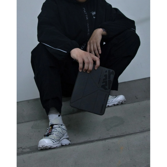 Тонкий чехол для iPad с защитным бортиком по всему периметру и удобной откидной крышкой, позволяющей просматривать контент, не держа устройство в руках; дополнен фирменной фактурной отделкой SPUNK и рельефным принтом, придающим ему особый стиль.
