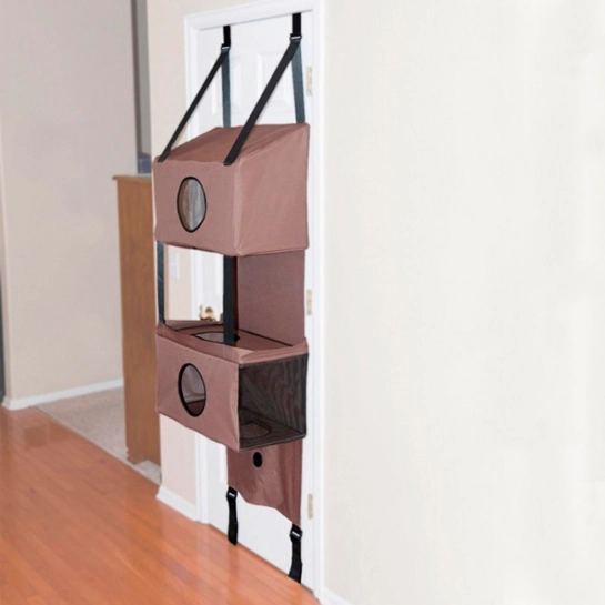 Конструкция крепится на дверь с помощью 4 металлических кронштейнов (2 сверху двери + 2 снизу), растягивается и фиксируется внизу. Широкие нейлоновые ремни удерживают уровни, стабилизируют их и регулируют установку домика в зависимости от высоты двери.