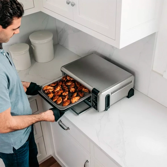 Есть несколько способов обжарки пищи. Самый популярный, конечно же, обработка в масле, однако оно сразу впитывается в продукт, делая его более калорийным и влияя на вкус. Хотите получить больше? Купите электропечь Ninja! Функция аэрофритюра обжаривает ваши крылышки и картофель фри нагретым воздухом, поэтому вы можете использовать на 75% меньше масла или жарить совсем без него. И, таким образом, истинный вкус и аромат с хрустящей золотистой корочкой будут радовать ваши вкусовые рецепторы с Ninja.