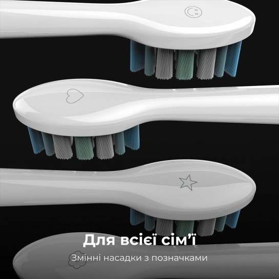 В комплект входят 4 насадки. Каждая имеет свою иконку на задней стороне. Таким образом вы сможете легко отличить свою и пользоваться зубной щеткой всей семьей.