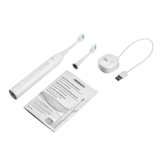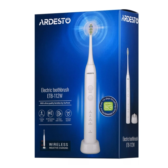 Электрическая зубная щетка ARDESTO ETB-112W со звуковой технологией чистки и средней жесткостью щетины DuPont. Намного лучше, чем обычные щетки, удаляет зубной налет и камень. Имеет четыре режима работы: стандартную чистку, для чувствительных зубов, отбеливание и массаж десен.
