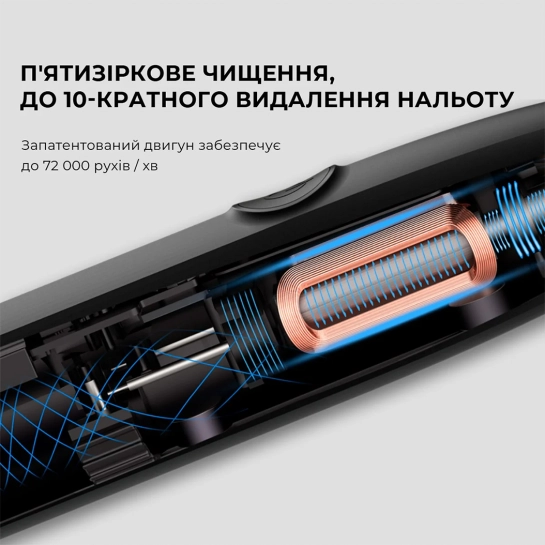 Зубная щетка оборудована высокопроизводительным двигателем, обеспечивающим вибрацию со скоростью до 72000 движений в минуту. Такая скорость обеспечивает постоянную очистку, эффективно очищает зубы и эмаль, очищает промежутки между зубами и деснами и способствует здоровью зубов и десен.
