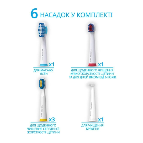 Зубная электрощетка предлагается со сменными насадками в количестве 6 шт., степень жесткости щетинок – средняя и мягкая. Материал изготовления нейлона.