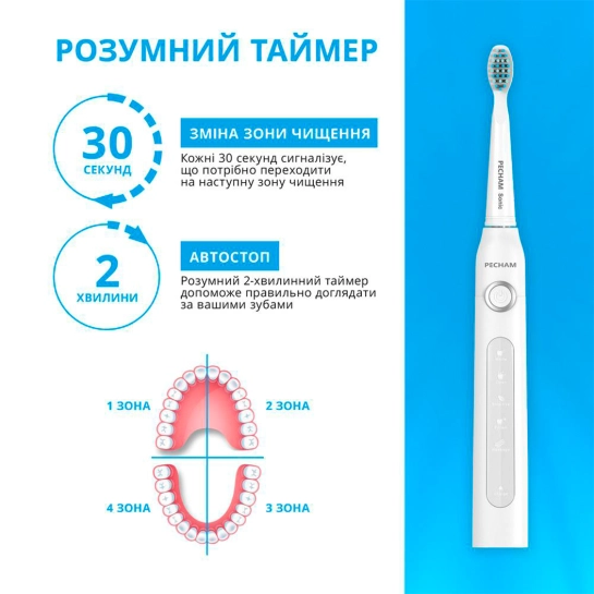 - Встроенный таймер напомнит, когда необходимо чистить следующую область, что позволяет сформировать правильные привычки, особенно у детей.