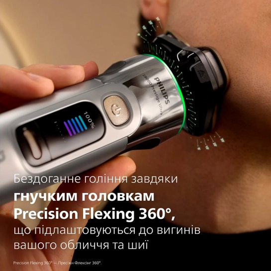 Полностью гибкие и компактные бреющие головки с прорезями для натяжения кожи динамично адаптируются к изгибам вашего лица. Обеспечивают постоянный контакт с кожей с точностью на 20% выше, чтобы захватывать щетину на сложных участках на шее и под носом.