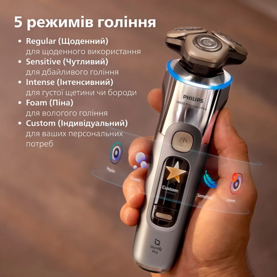 5 режимов бритья адаптируют мощность и контролируют давление для индивидуального бритья: Regular (Ежедневный) — для повседневного использования, Sensitive (Чувствительный) — для бережного бритья, Intense (Интенсивный) — для густой бороды, Foam (Пена) — для влажного бритья, Custom (Индивидуальный) — для ваших персональных потребностей.