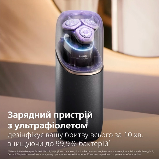 Наше первое УФ-зарядное устройство. Оно дезинфицирует вашу бритву всего за 10 минут, уничтожая 99,9% бактерий. Устройство заряжает вашу бритву, полного заряда хватает на 6 недель бритья благодаря встроенному литий-ионному аккумулятору. USB-кабель для зарядки в комплекте.